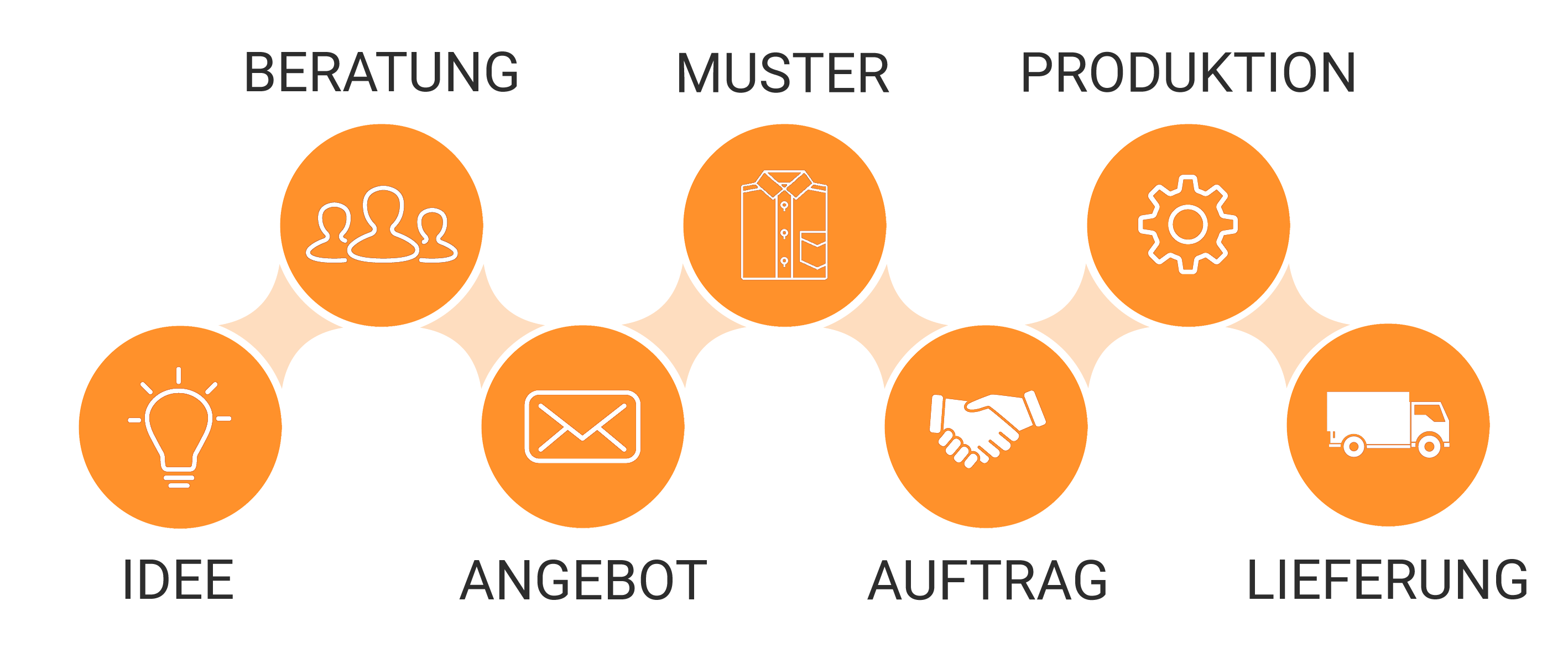 Wie funktioniert das Ganze? Zum besseren Verständnis über die Phasen eines Produktionsauftrags, geben wir Euch das unten stehende Schaubild an die Hand. Mehr Details erhaltet Ihr unter Produktion & Design.